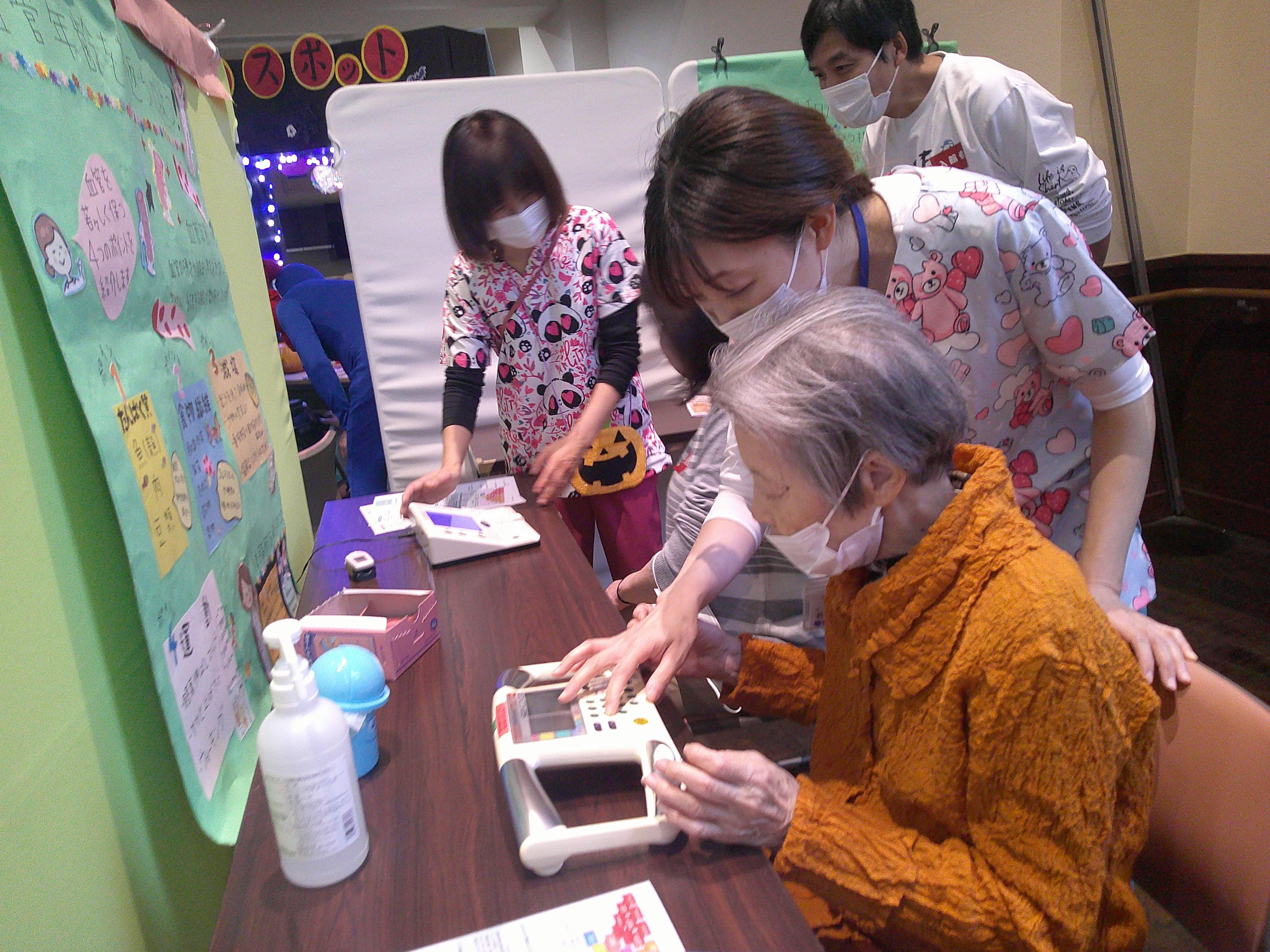 健康ブースでは、ベジチェック、血管年齢、老化物質チェック、握力測定などができます。