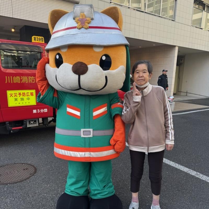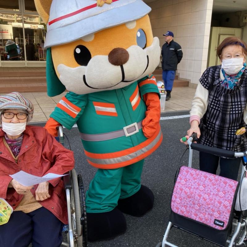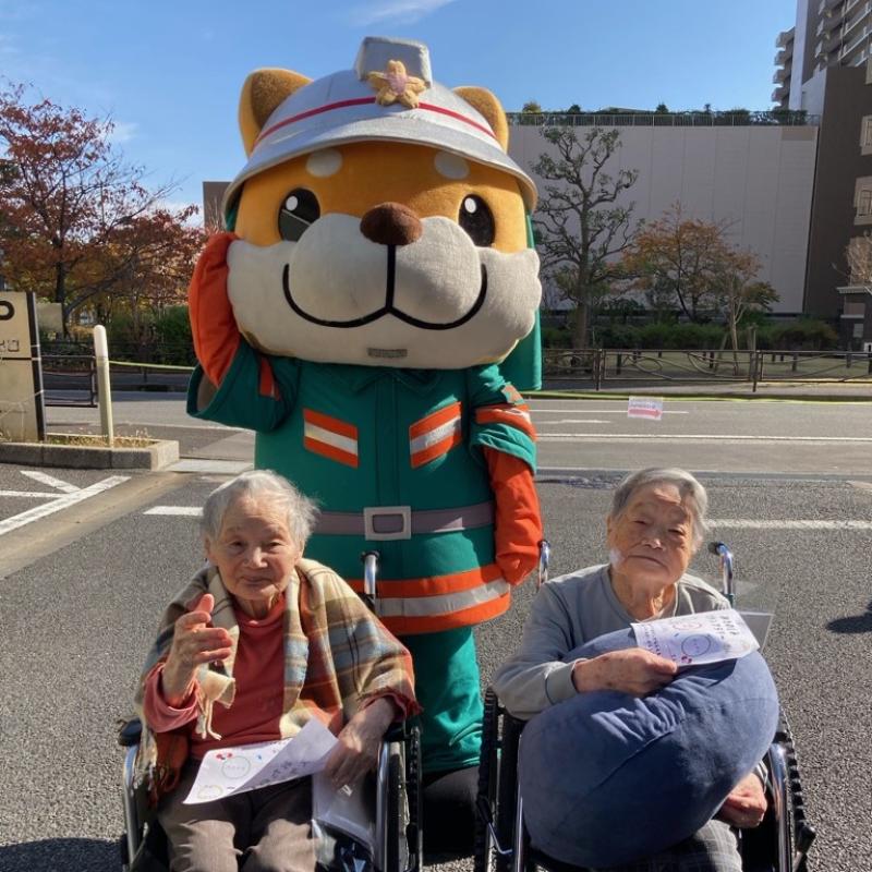 外部の方への防災関連のPRが主でしたが、ご入居者さまは、消防隊のマスコットと記念撮影したり、