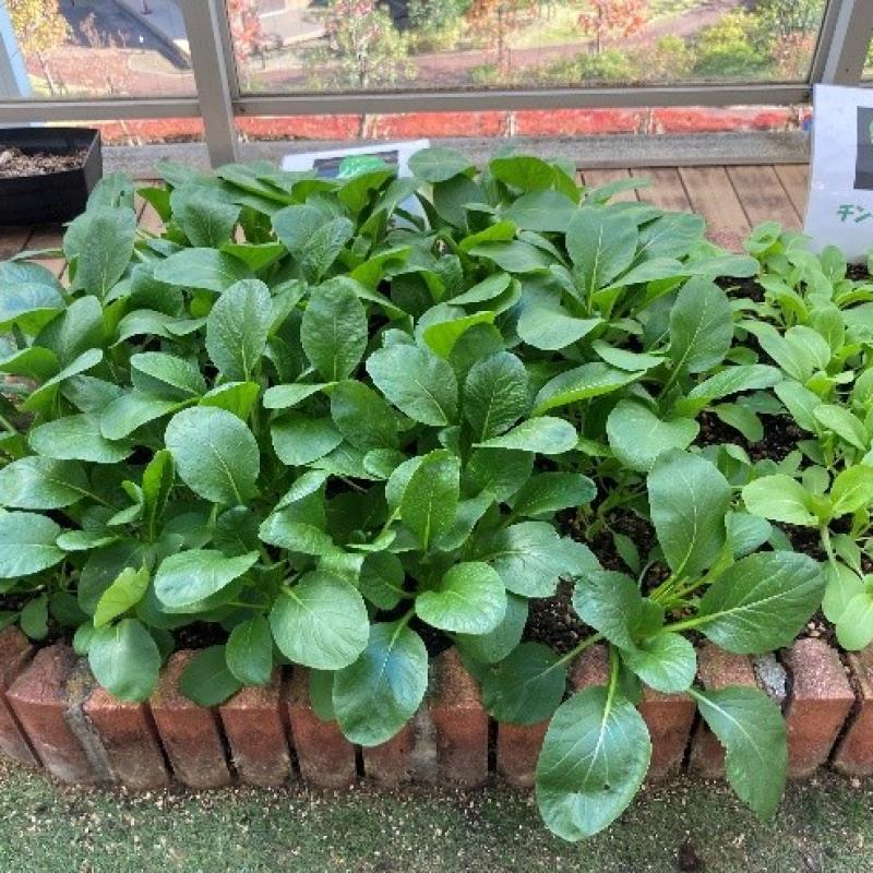 1か月半で大きくなった小松菜を、ご入居者様と一緒に