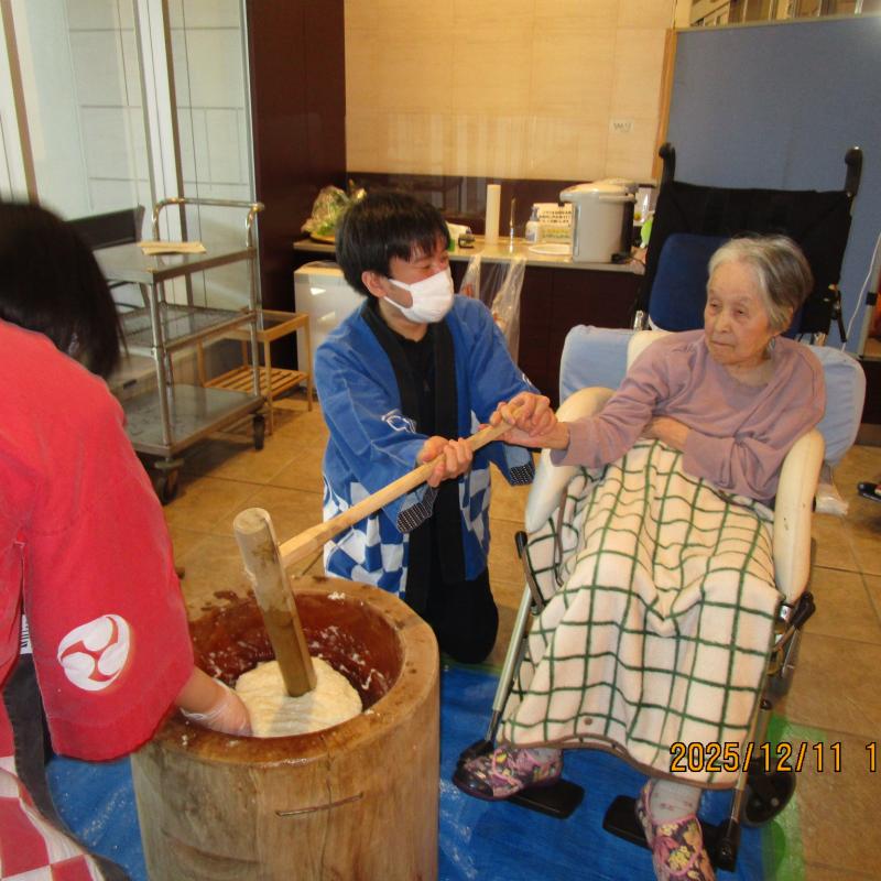皆さま、職員と一緒に餅つきを楽しみましたが、残念ながら安全面と衛生面から、お餅を食べる事はできません。