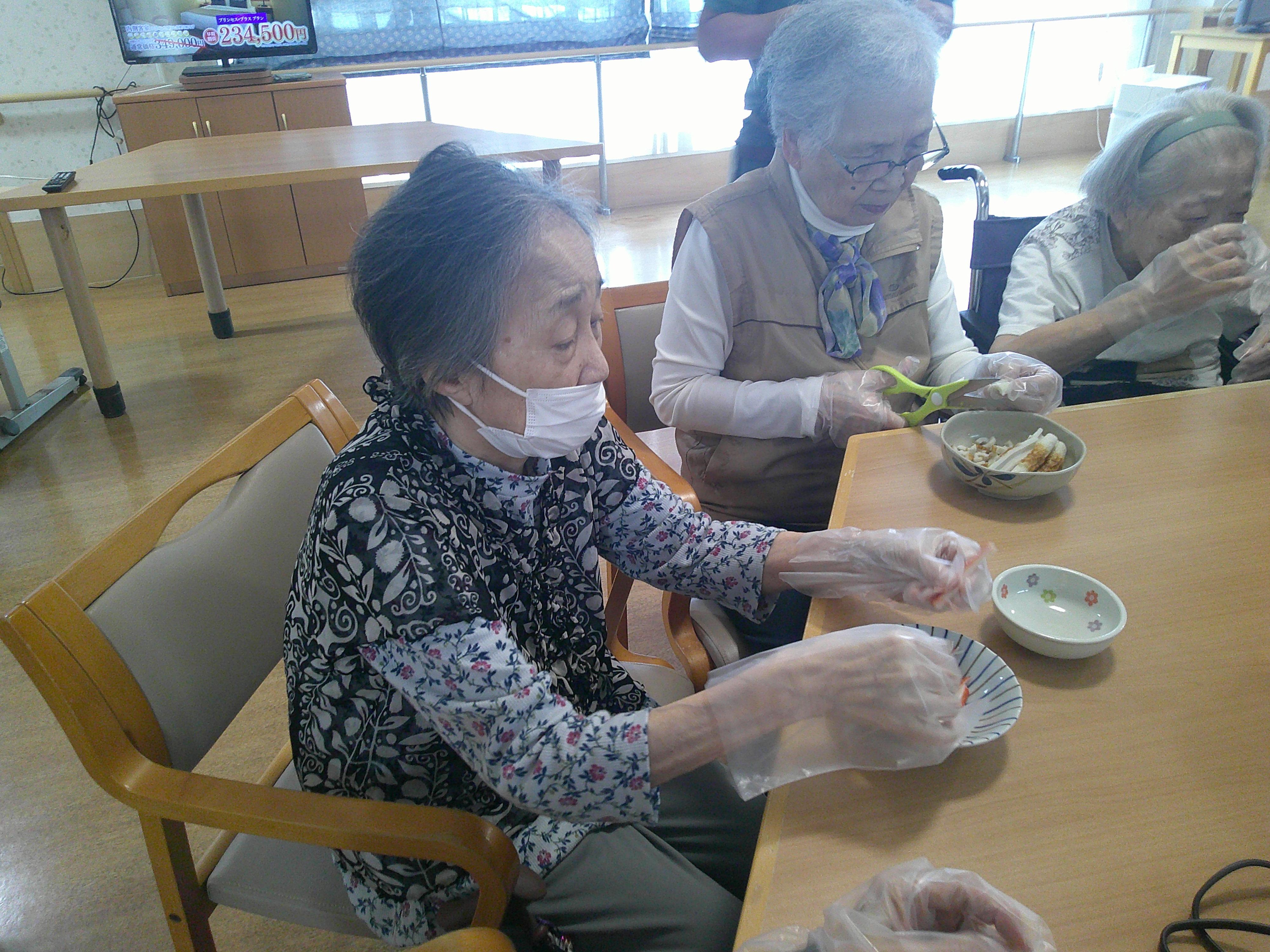 5月には、施設でふきの収穫がありました!ご利用者様に下準備(葉っぱとり、すじ取り)をしていただき、厨房さんにふきの煮物を作ってもらいました