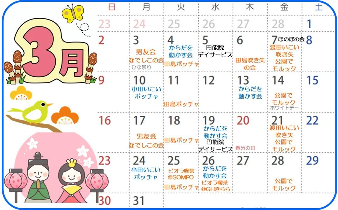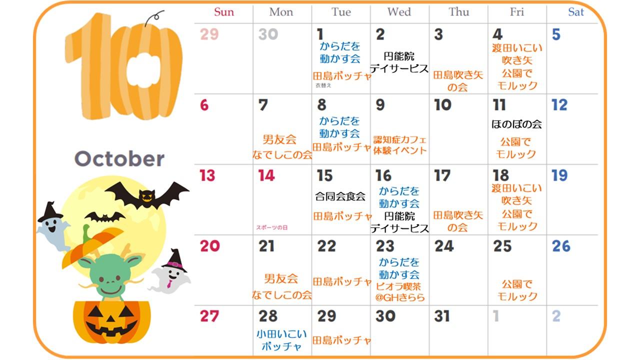 カレンダー内の青字が午前、オレンジが午後、黒字が一日の活動となります。