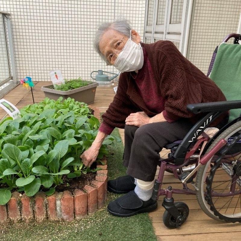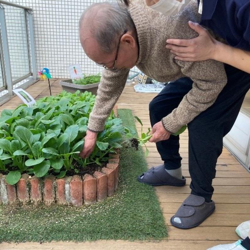 1か月半で大きくなった小松菜を、ご入居者様と一緒に