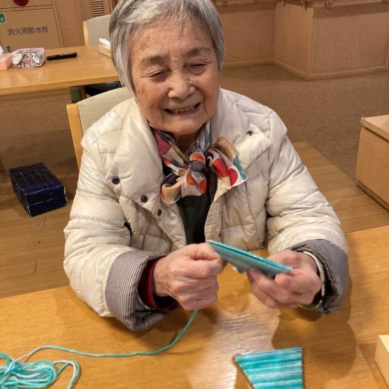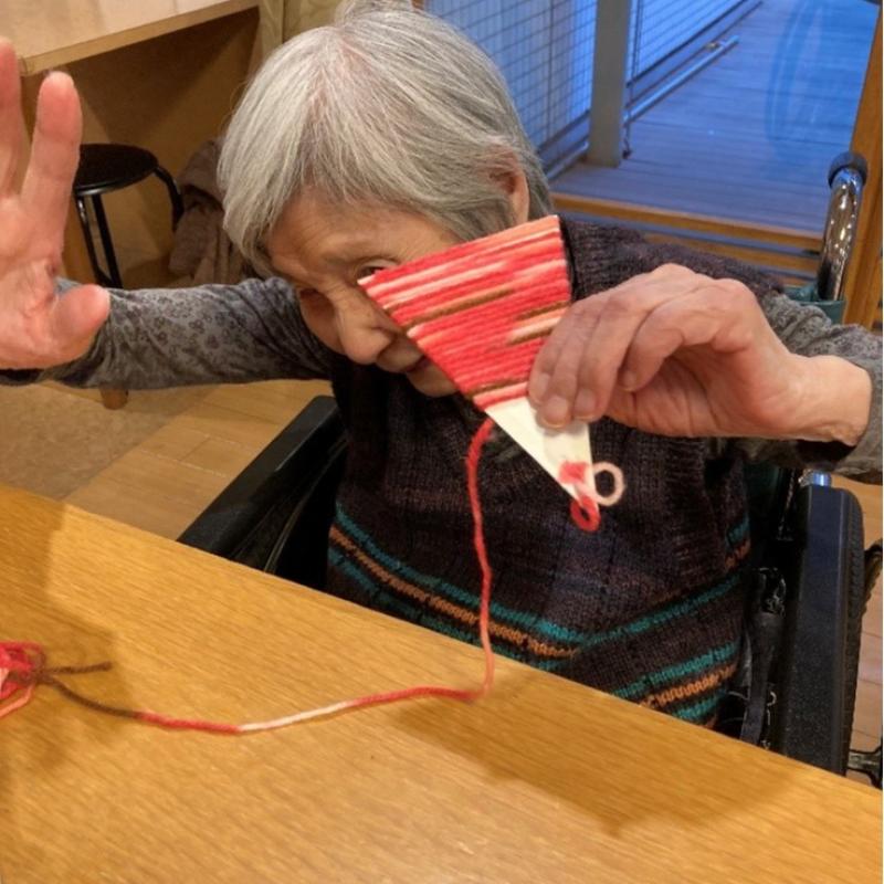 ご利用者の方々には、赤、緑、ピンクの中から好きな色の毛糸を選んでもらい、