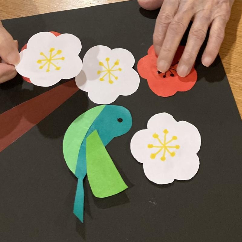 ご利用者の方々に、お一人ずつ、画用紙1枚に赤と白の梅の花と鶯を貼って