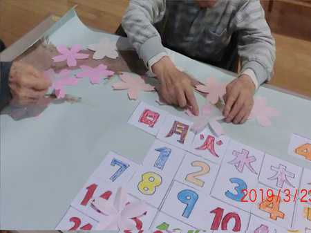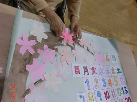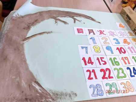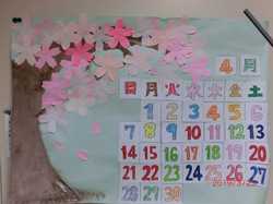 4月のカレンダーを作成しました。 桜の木は絵の具を手で伸ばして描き、 桜の花は少しずつ多くのご利用者さまに貼っていただき、 桜の木を完成させました。