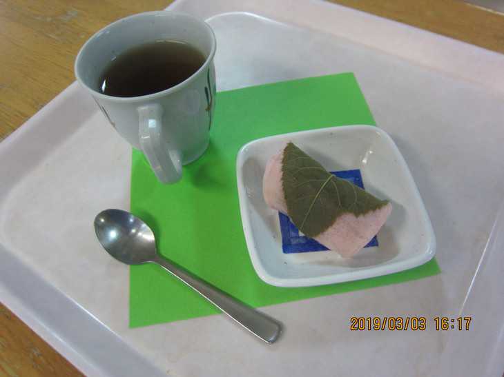 おやつには桜餅がでました。「美味しい」と皆様に満足していただけました。