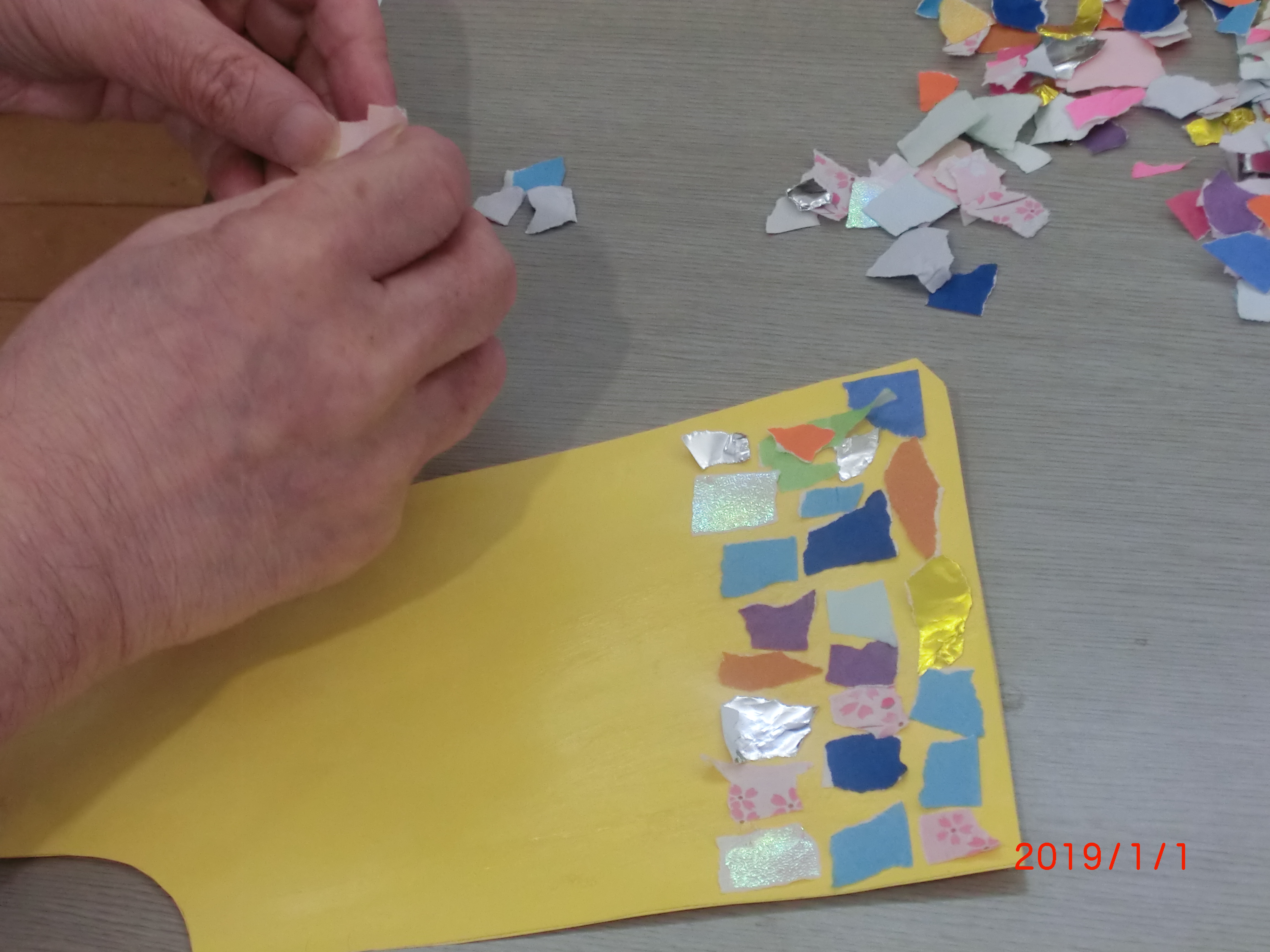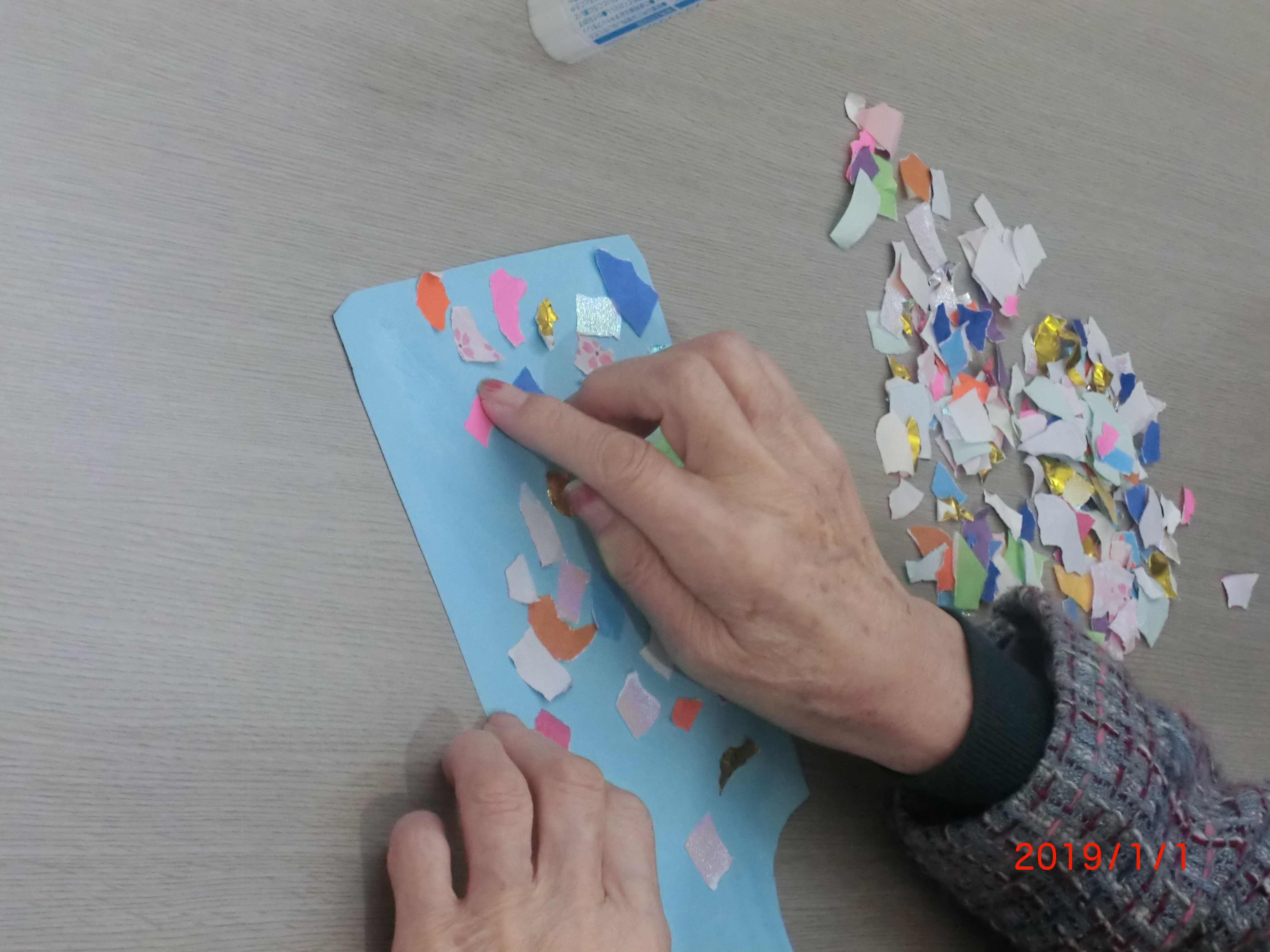 折り紙をちぎる、貼る作業では一人ひとりの性格がわかるものになりました。