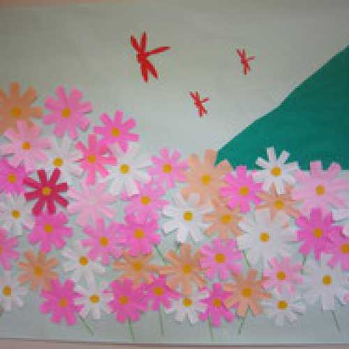 まずは貼らずに、模造紙に花を置いて色や花のバランスを決めました。