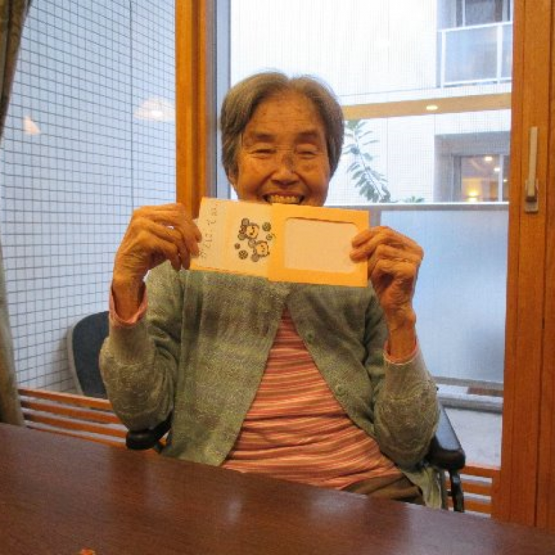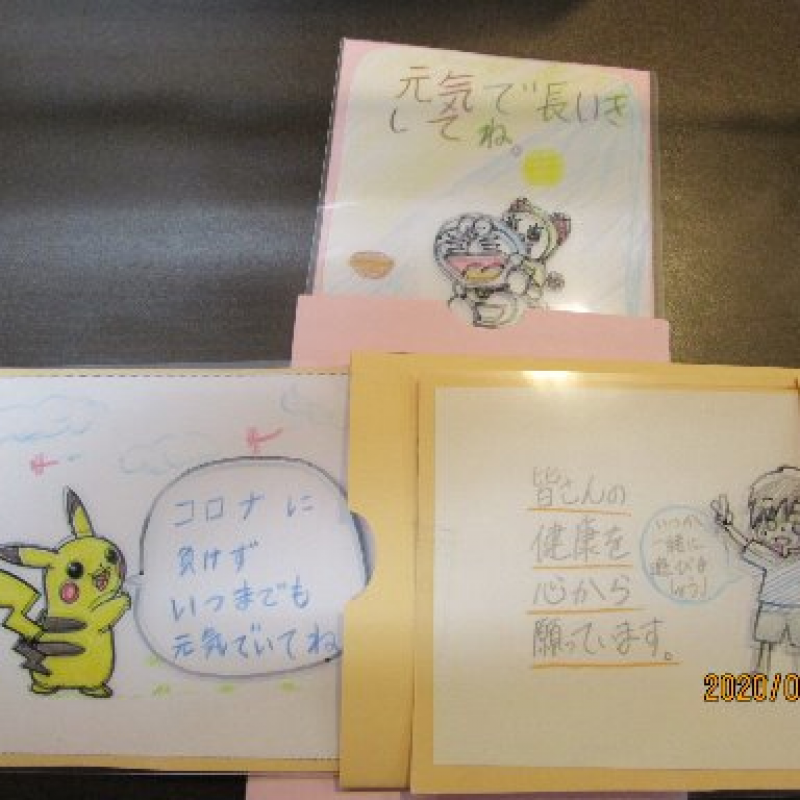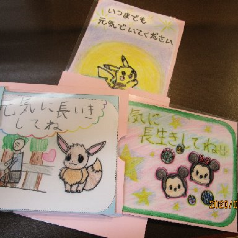 9月19日に渡田こども文化センターの職員さんと代表の小・中学生4名が来所され、敬老の日に合わせ地域の子どもたちが作ってくれた沢山のメッセージカードをいただきました