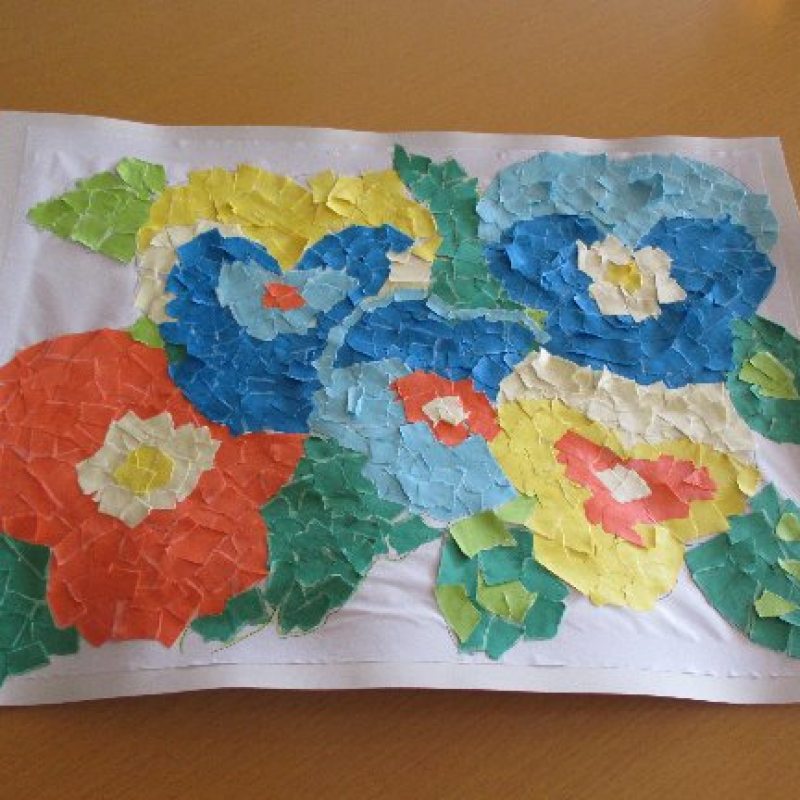 途中で飽きてしまう方もいましたが、器用に紙をちぎる方、貼る方がおられ、出来上がりはビオラの花にはちょっと見えないかもしれませんが・・・