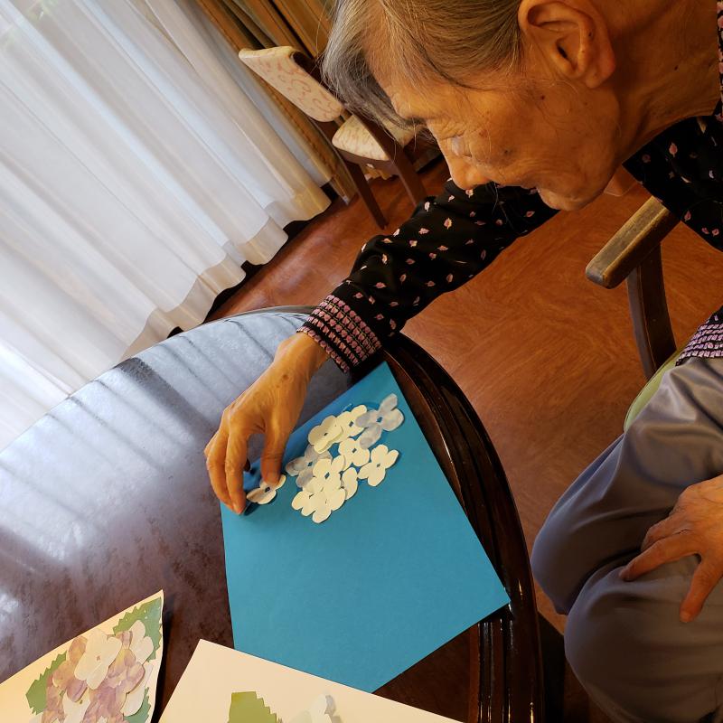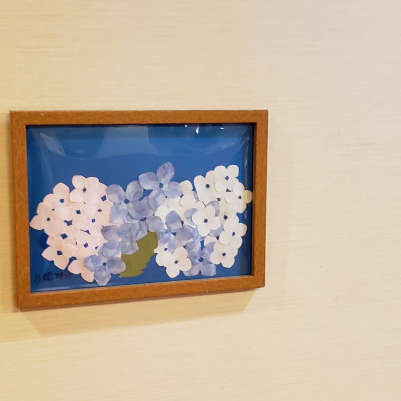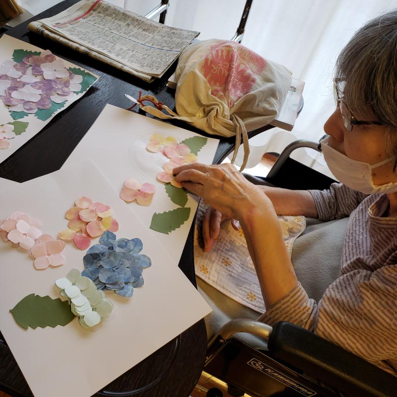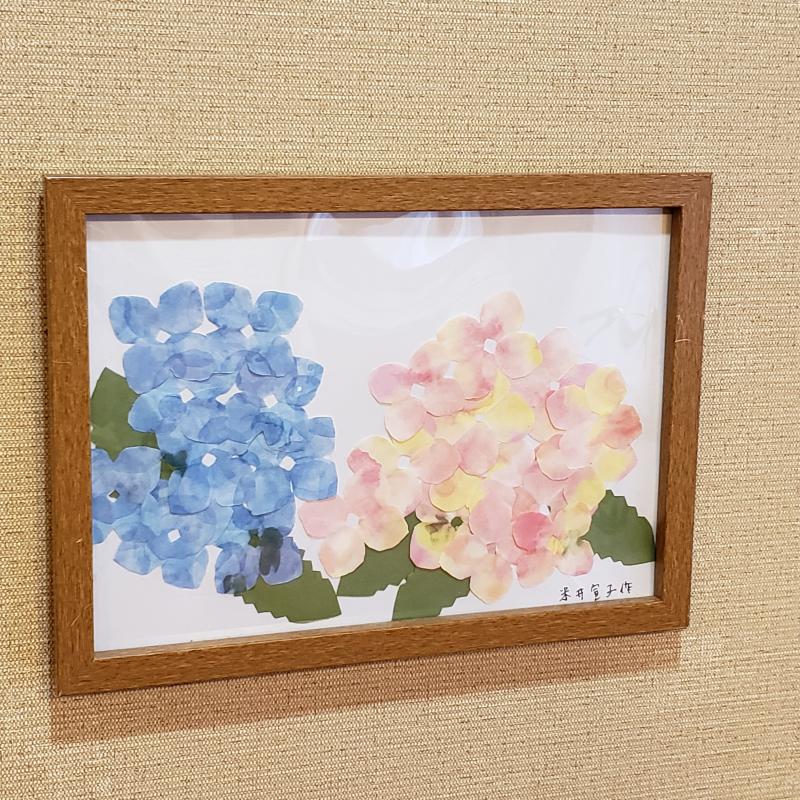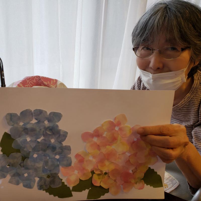 「梅雨の時期だから紫陽花じゃない」との声で紫陽花の貼り絵にしました。
