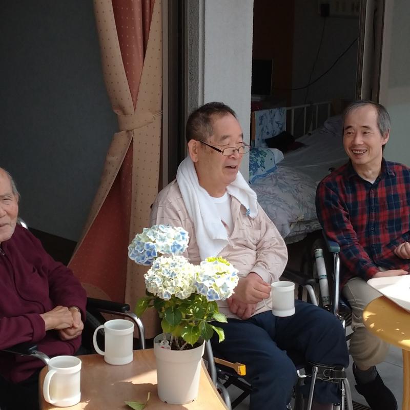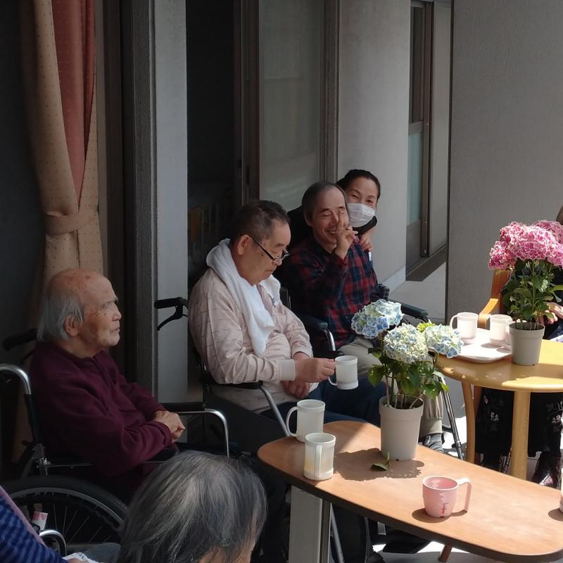 お天気に恵まれた先日、ゆり棟でベランダで10時のお茶を楽しんでいただきました