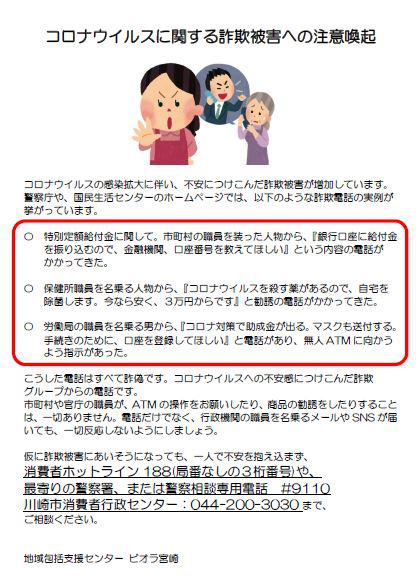 また、ビオラ宮崎事務所でも新型コロナウィルス詐欺の注意喚起チラシを置いています。
