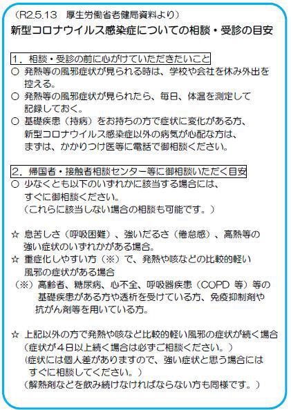新型コロナウィルスの相談・受診の目安等のチラシを入れています。