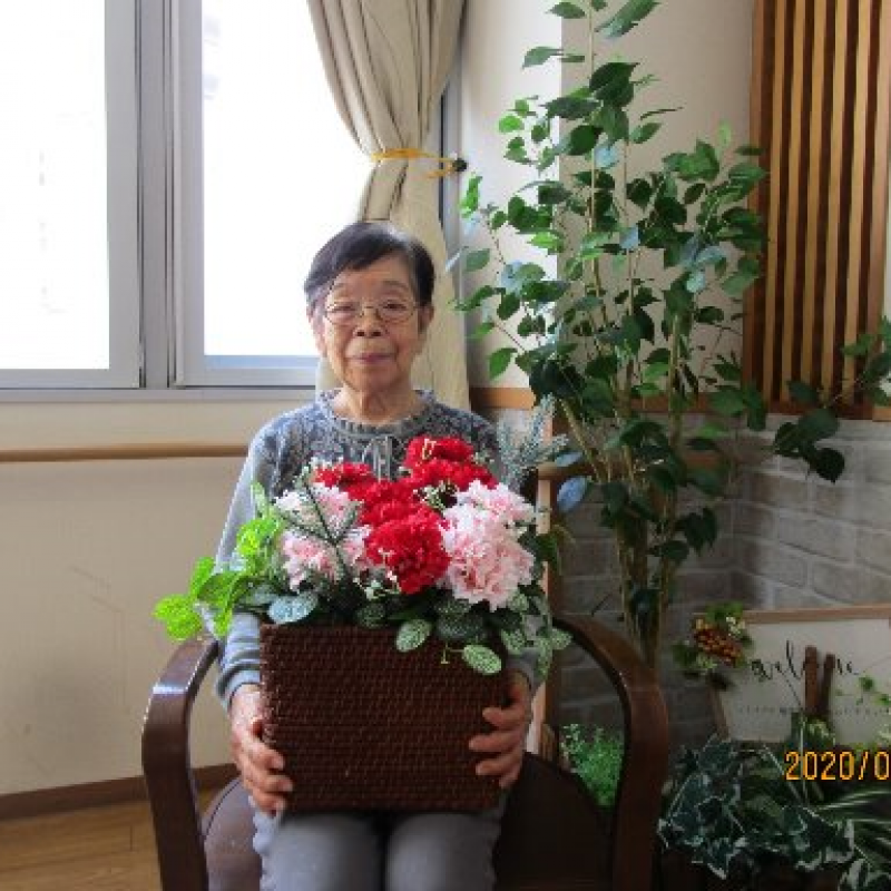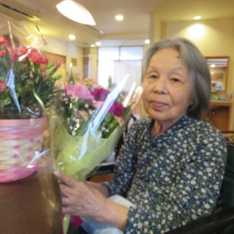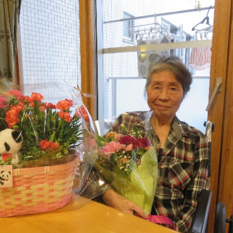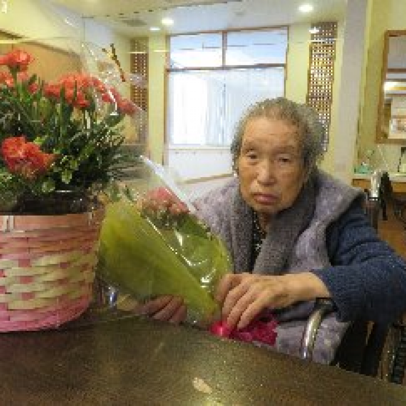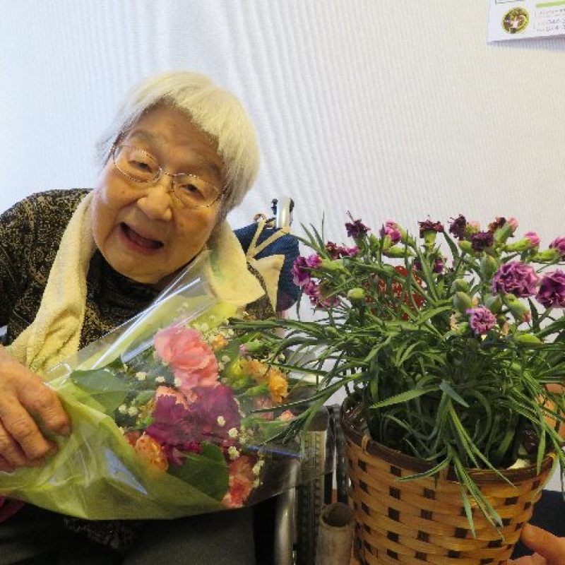 母の日に、カーネーションと一緒に記念撮影をしました。