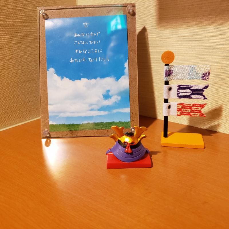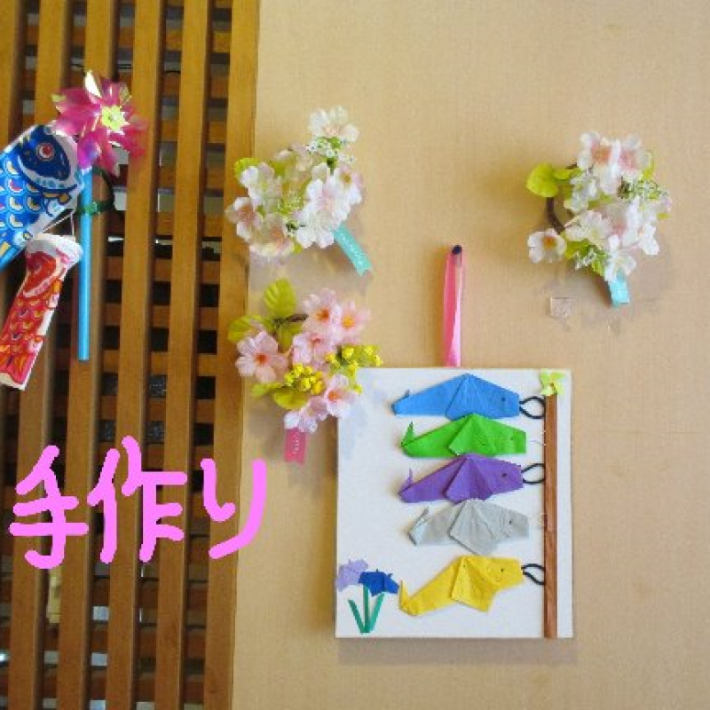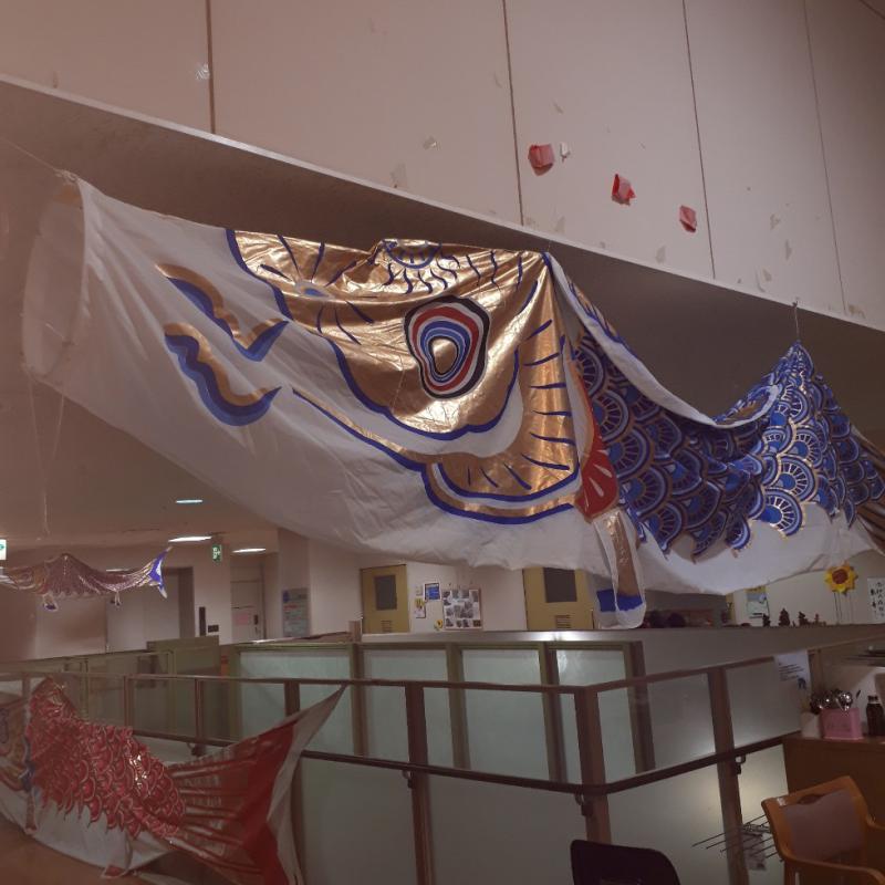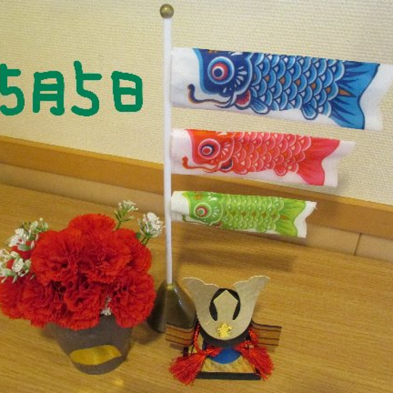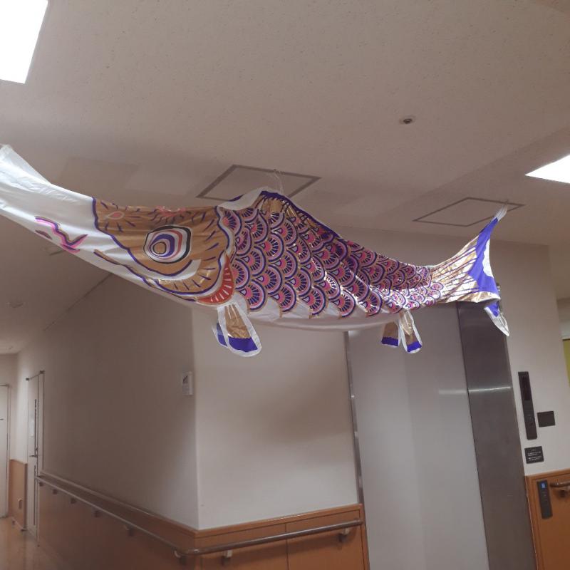 5月になり、施設の中は端午の節句に向けて鯉のぼりや兜・近所の方に頂いた菖蒲を飾っています。