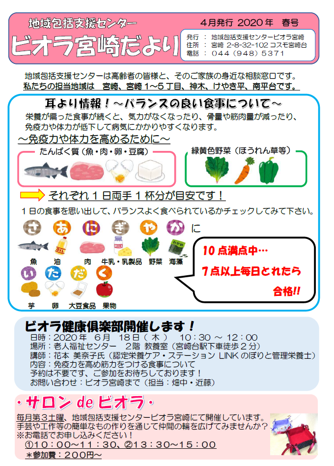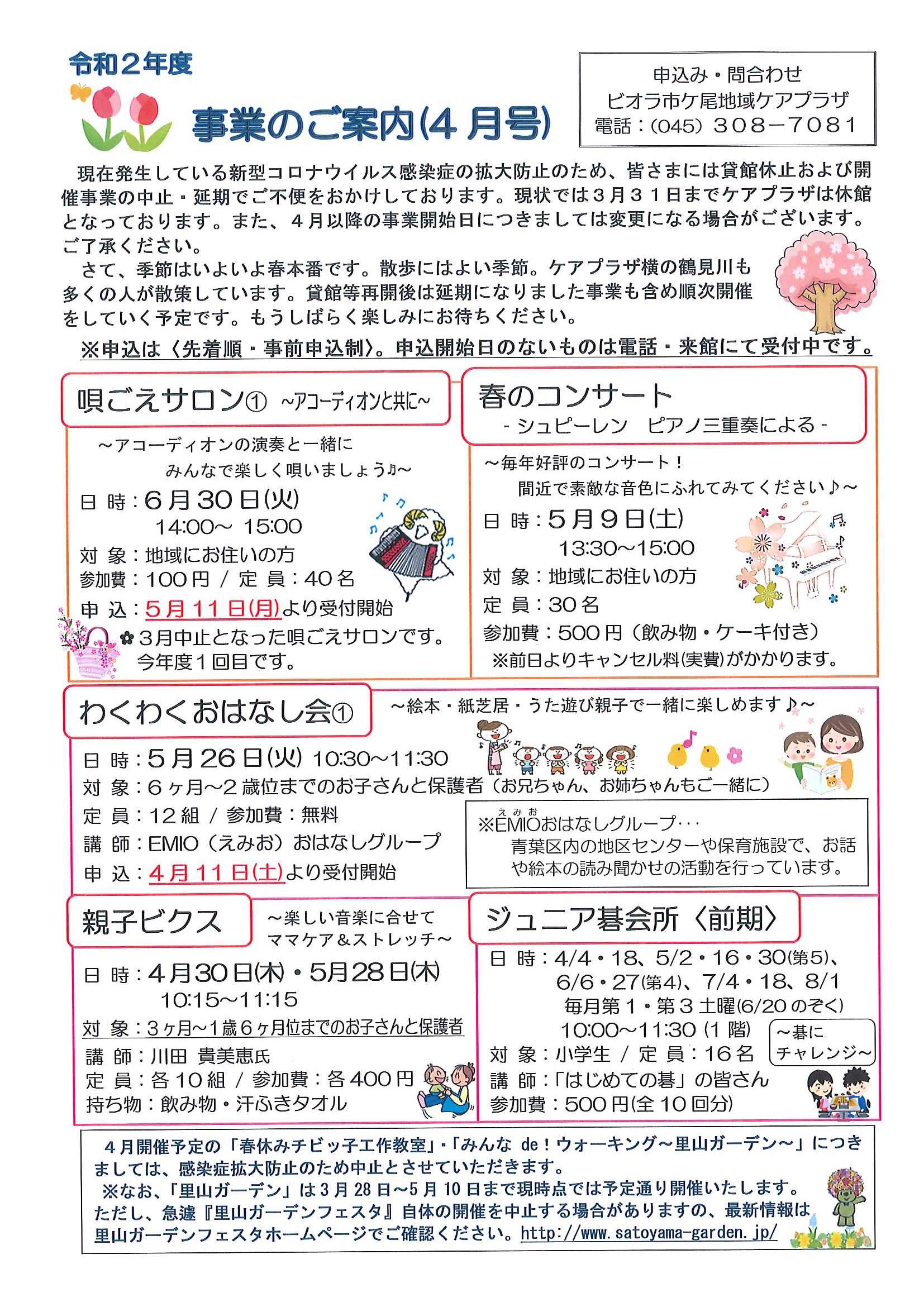 3月に続いて、宮一公園体操、サロンdeビオラなど、事業の自粛を継続することにしました。