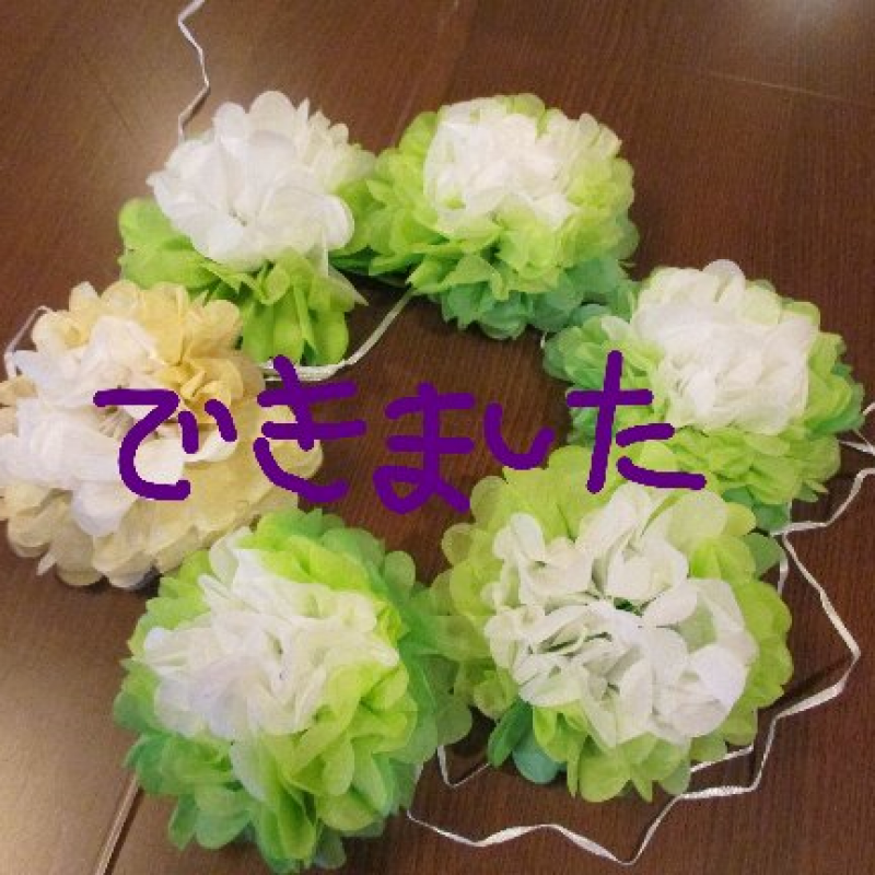 本日は、『フラワーポンポン』を作って、壁に飾りました。