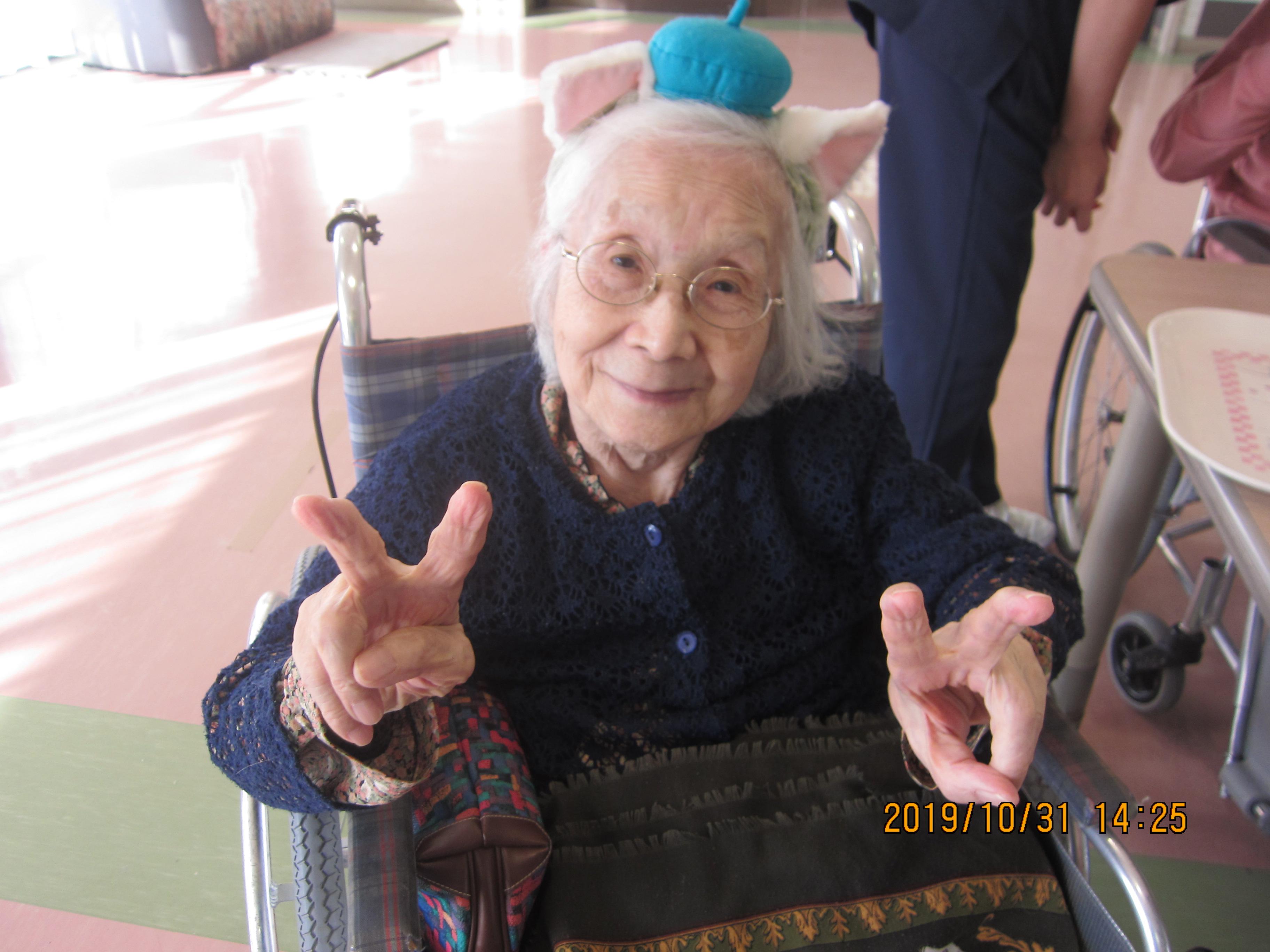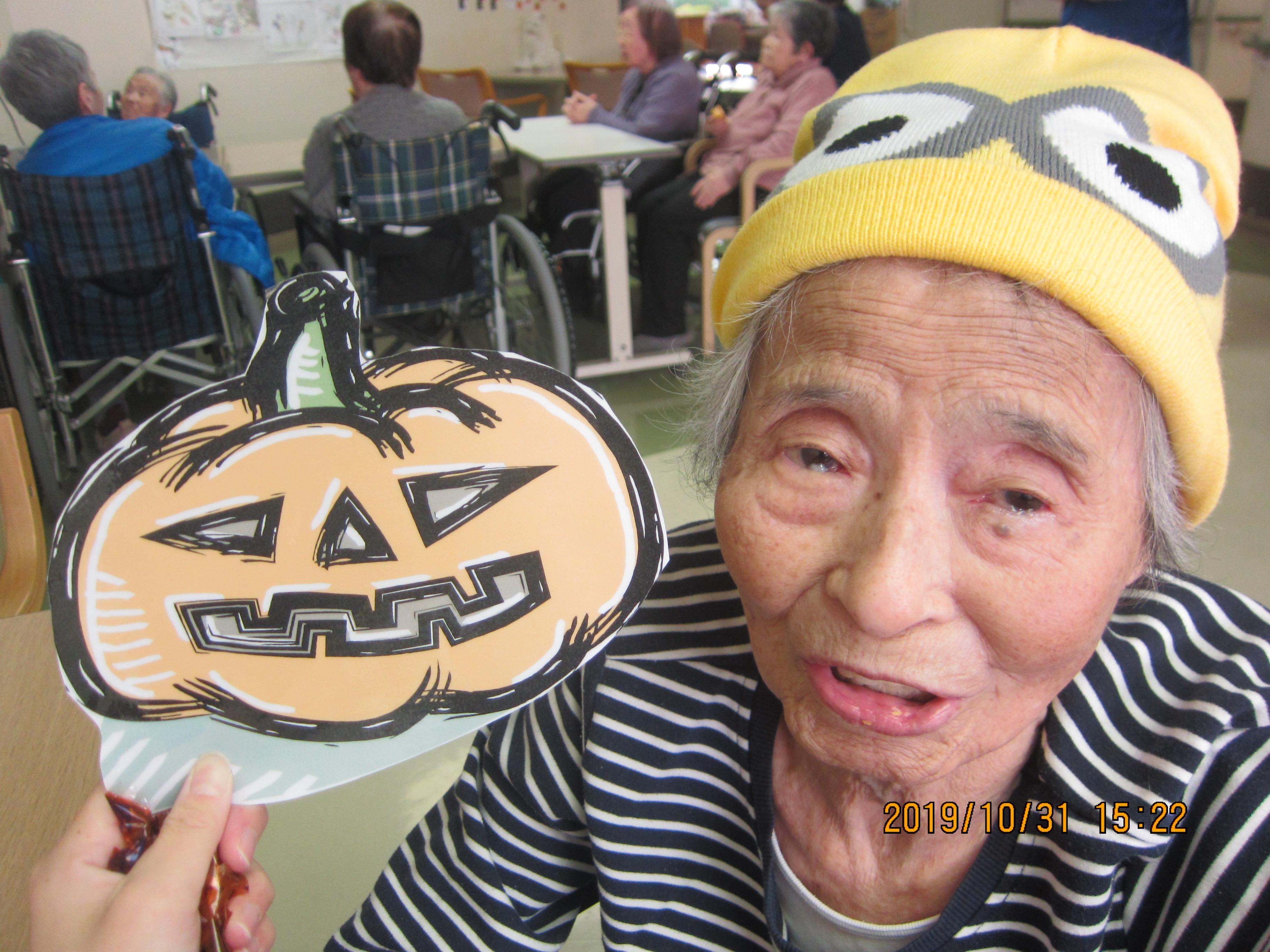 中川の里の特別養護老人ホームでは、10月31日にハロウィーンのイベントを行いました。数日前よりフロアの壁面や窓をフロアの職員にて飾りつけ、当日にはカボチャ風味のお菓子を1人1ずつ配るという簡単なイベントでしたが、利用者の皆様「美味しいねえ」と喜んでくださり、笑顔も見られました。また、仮装をイメージして、キャラクターデザインのカチューシャやニット帽子を身に着けて頂き、写真撮影も行いました。「ええ、恥ずかしいよ」と言いながらもピースをして下さり、近くのテーブルで盛り上がりました。
