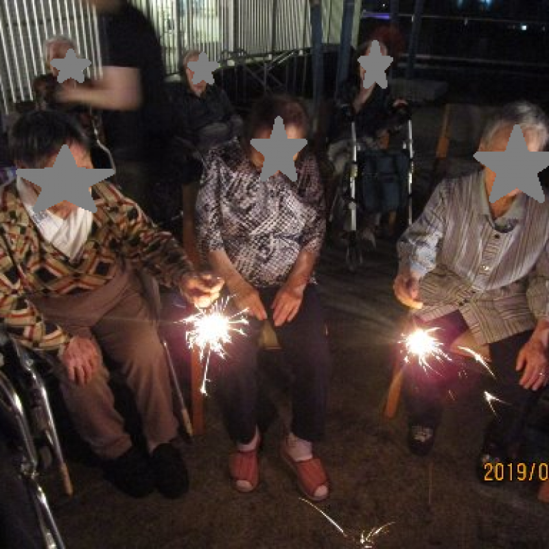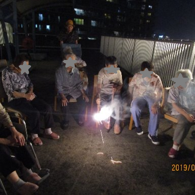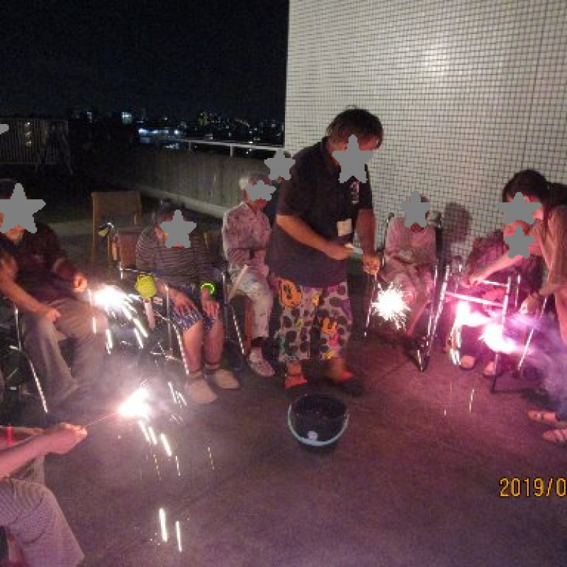 今年は鶴見川花火大会が中止のため、ガッカリされているご利用者さまと一緒に線香花火などで楽しみました